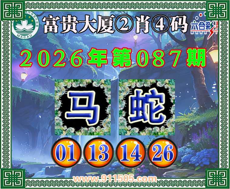 087期:【富贵大厦】 👛②肖④码👛【马】【01.13.14.26】开:蛇26